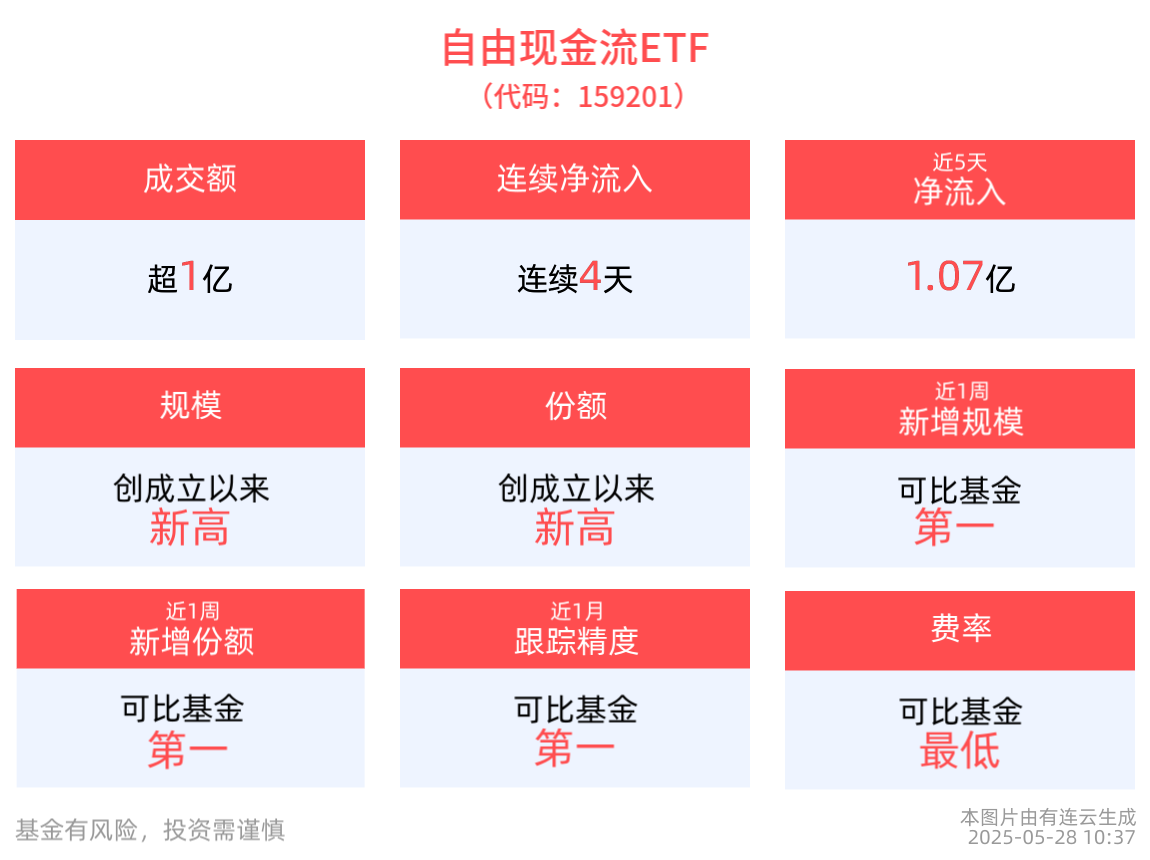 跟踪精度方面,截至2025年5月27日,自由现金流ETF近1月跟踪误差为0.014%,在可比基金中跟踪精度最高。